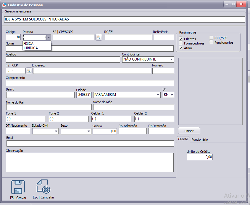 Nesta tela você também poderá informar os dados de funcionário, como admissão, salario, data de nascimento e data de demissão.
